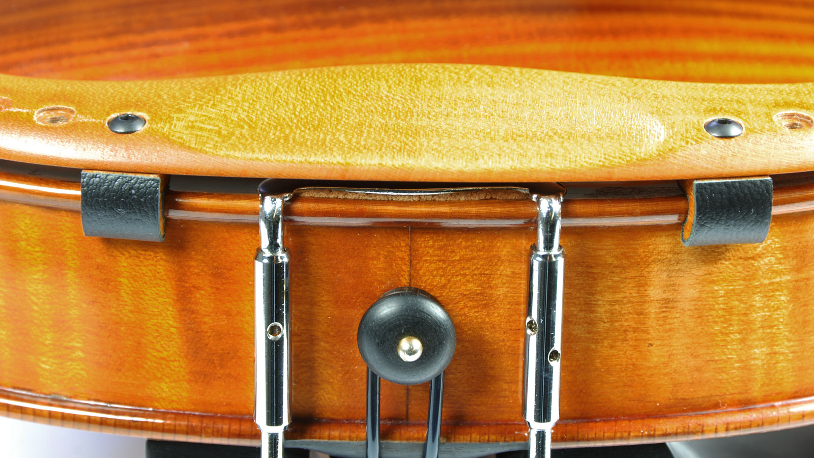 Die Schulterstütze hat eine vorgeformte Biegung, die komfortabel für die meisten Spieler ist. Einige Spieler stellen fest, dass sich die dünne Holzschicht mit der Zeit an die Form ihrer Schulter anpasst. Falls eine andere Form gewünscht wird, entfernen Sie die Stütze und verändern sie vorsichtig die Biegung.